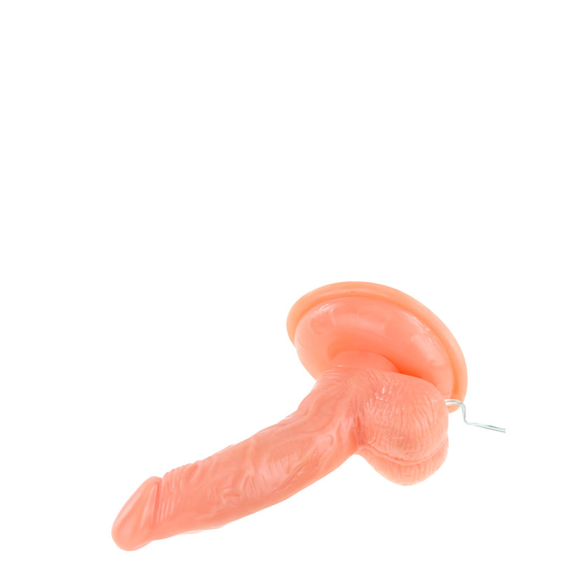 Pênis realístico com veias, escroto e ventosa. Possui vibração multivelocidade. Peso: 0,176g.