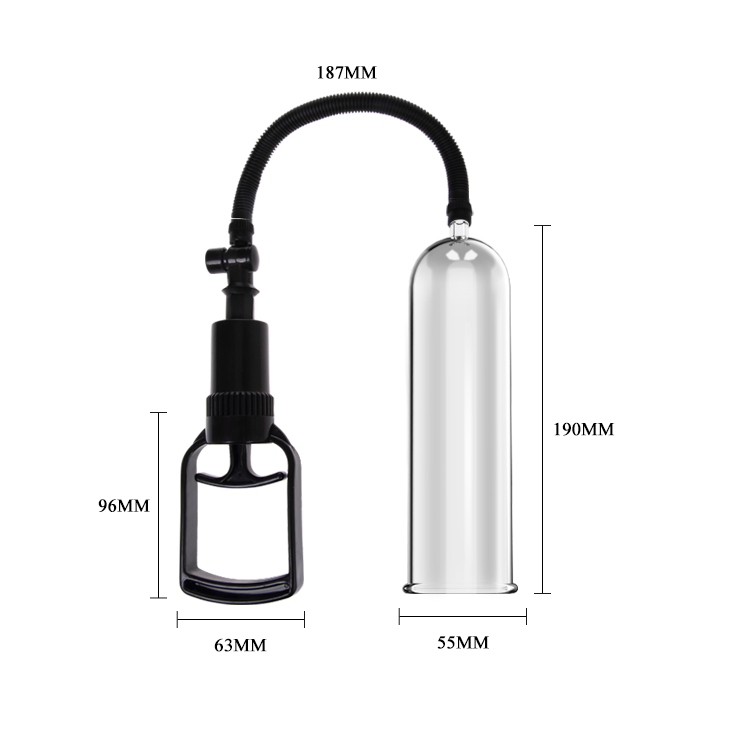 – Bomba peniana com sistema de alavanca, mangueira flexível com 3 anéis de diferentes diâmetros e anel formato vagina em Cyberskin.
