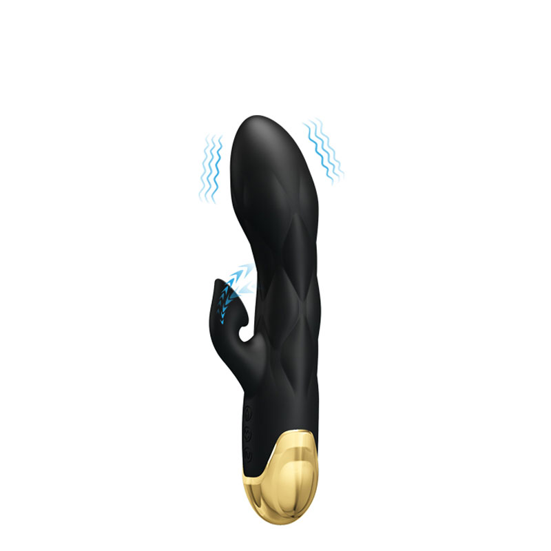 Vibrador recarregável escalonado com estimulador clitoriano sugador, base feita em aço inoxidável banhada em ouro 18k. Possui 7 modos de vibração e 7 modos de sucção.