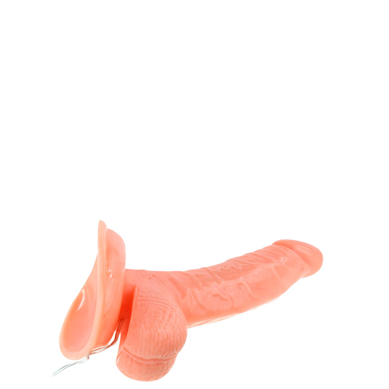 Pênis realístico com veias, escroto e ventosa. Possui vibração multivelocidade. Peso: 0,176g.