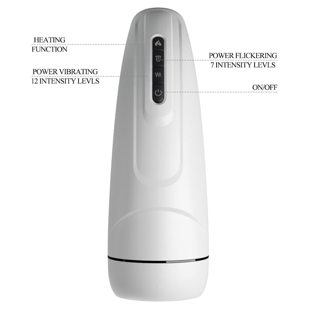 Masturbador masculino. Recarregável, com formato anatômico e inovador, tem seu interior texturizado. Com 12 modos de vibração, possui super aquecimento de até 48°C, com língua texturizada e super aquecimento que possui 7 modos de lambidas. Com gemidos gravados em alta qualidade que podem ser escutados através do fone de ouvido. Design inovador que valoriza seu botões de comando e firmeza no manuseio durante o uso. Acompanha carregador USB. Medidas: 3,3 x 9 x 26cm. Peso: 508g. Material: ABS+TPR.chilisexshop