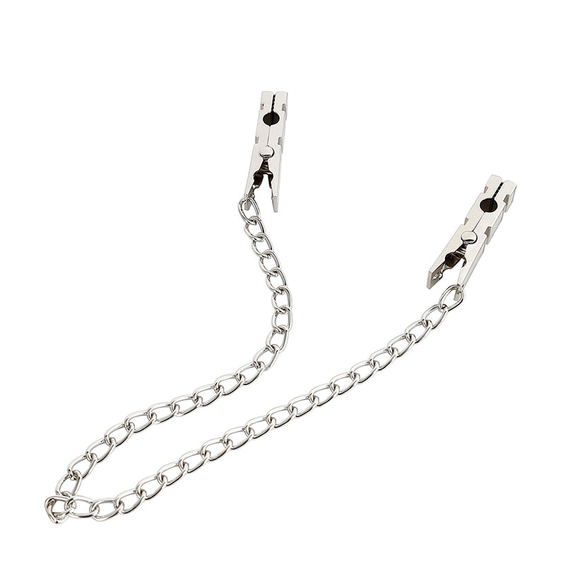 Grampos para mamilos em metal com presilhas formato prendedor de roupas, possui corrente que interliga os dois grampos.