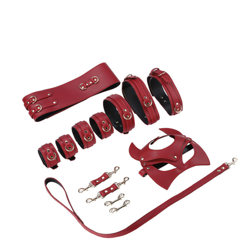 Kit bondage com 7 peças. Possui 1 par de algemas ,1 par de tornozeleiras, 1 cinturão com grilhões para prender, 1 par de perneira, 1 máscara com rebites, 1 coleira , 1 guia com puxador e corrente. Material: Couro sintético e Metal.