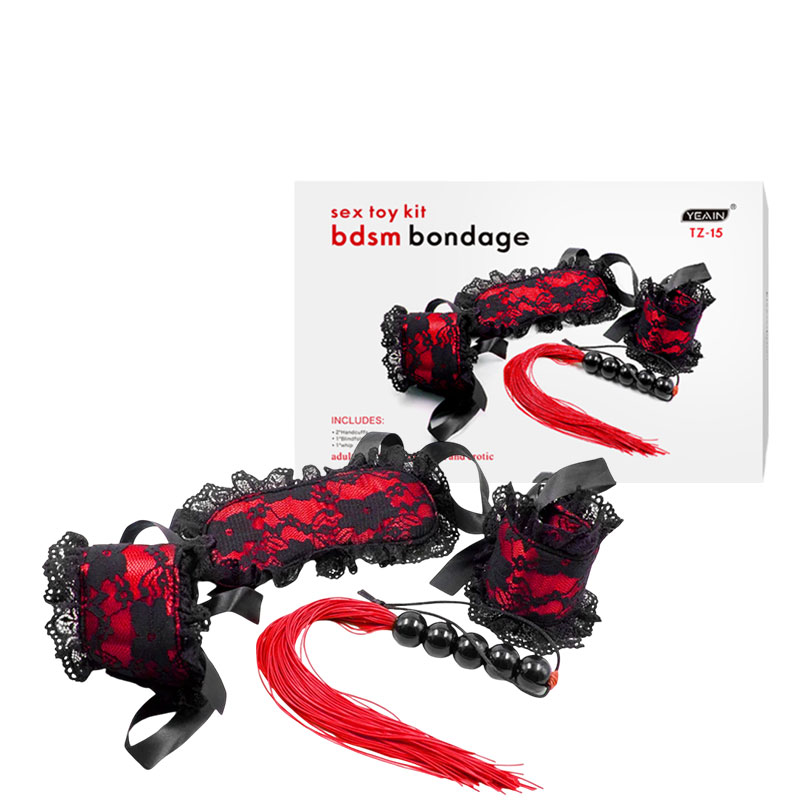 Possui: 1 venda, 1 par de algemas e 1 chicote com franja de borracha. Material: Elastano e renda