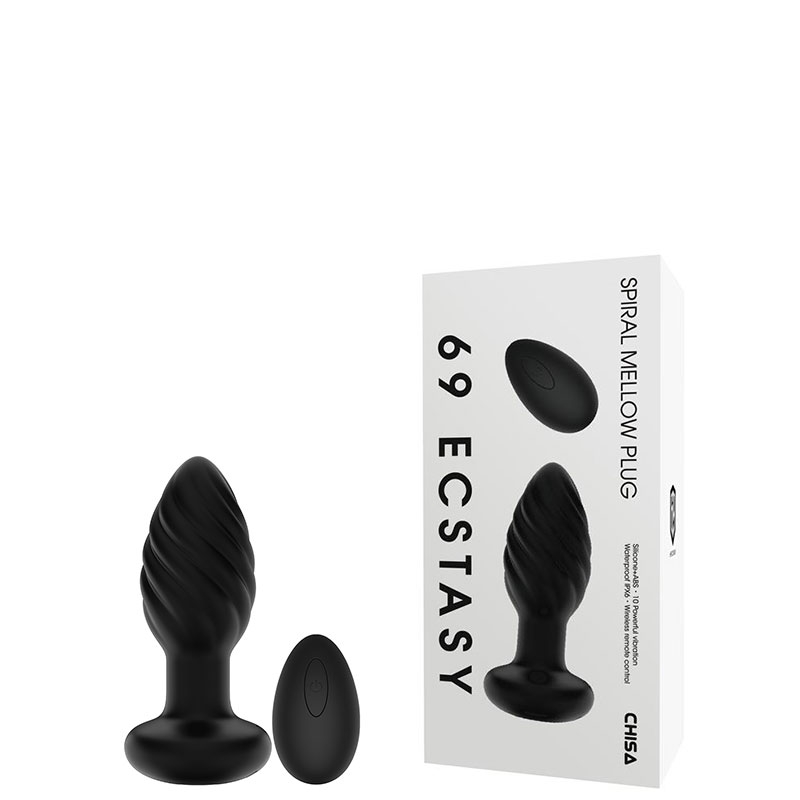 Plug anal recarregável com textura espiral e controle remoto. Possui 10 modos de vibração.